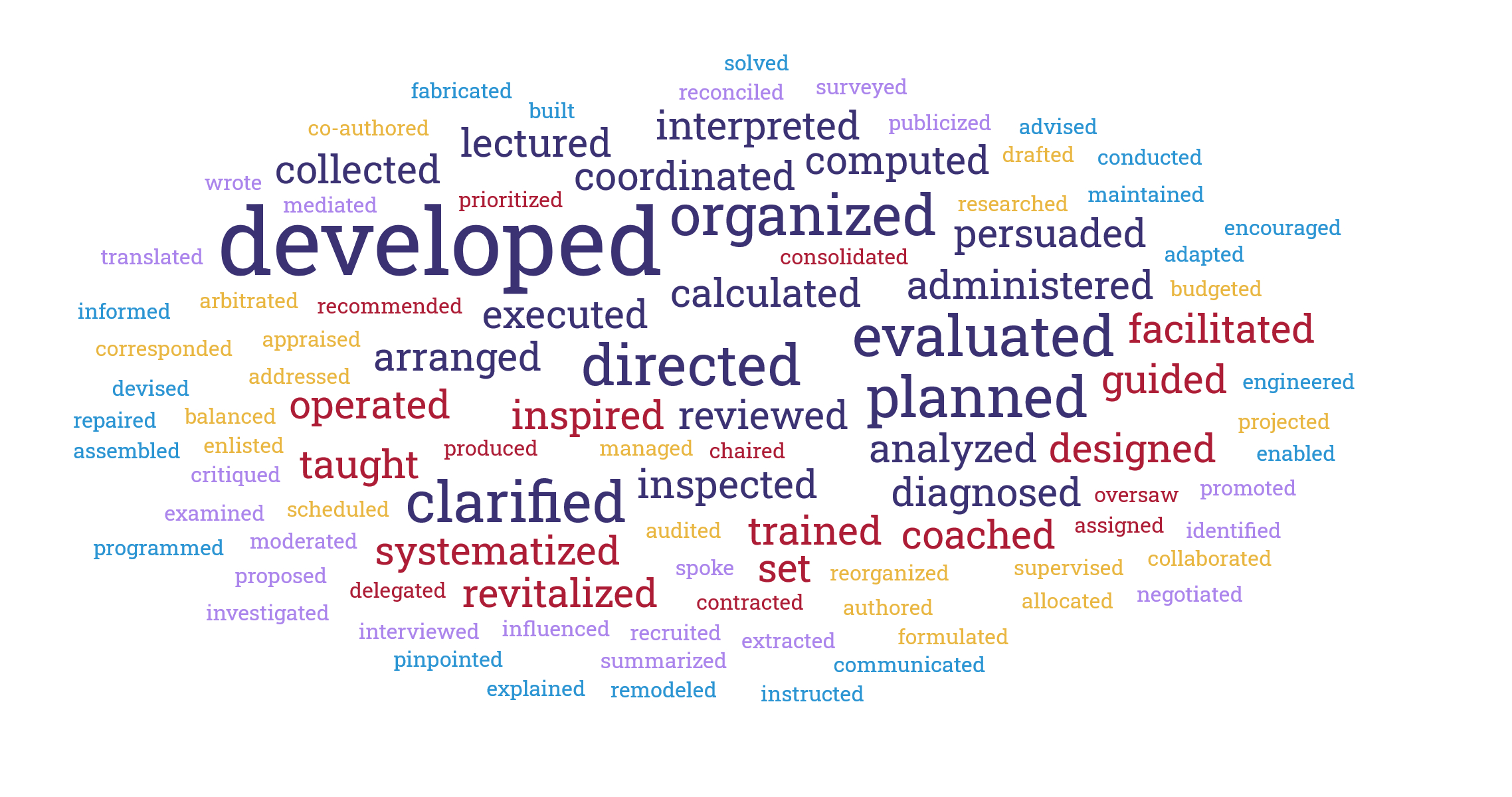 This table is a practical reference for resume writing. Candidates can select verbs from each category to accurately represent their experience and skillset.